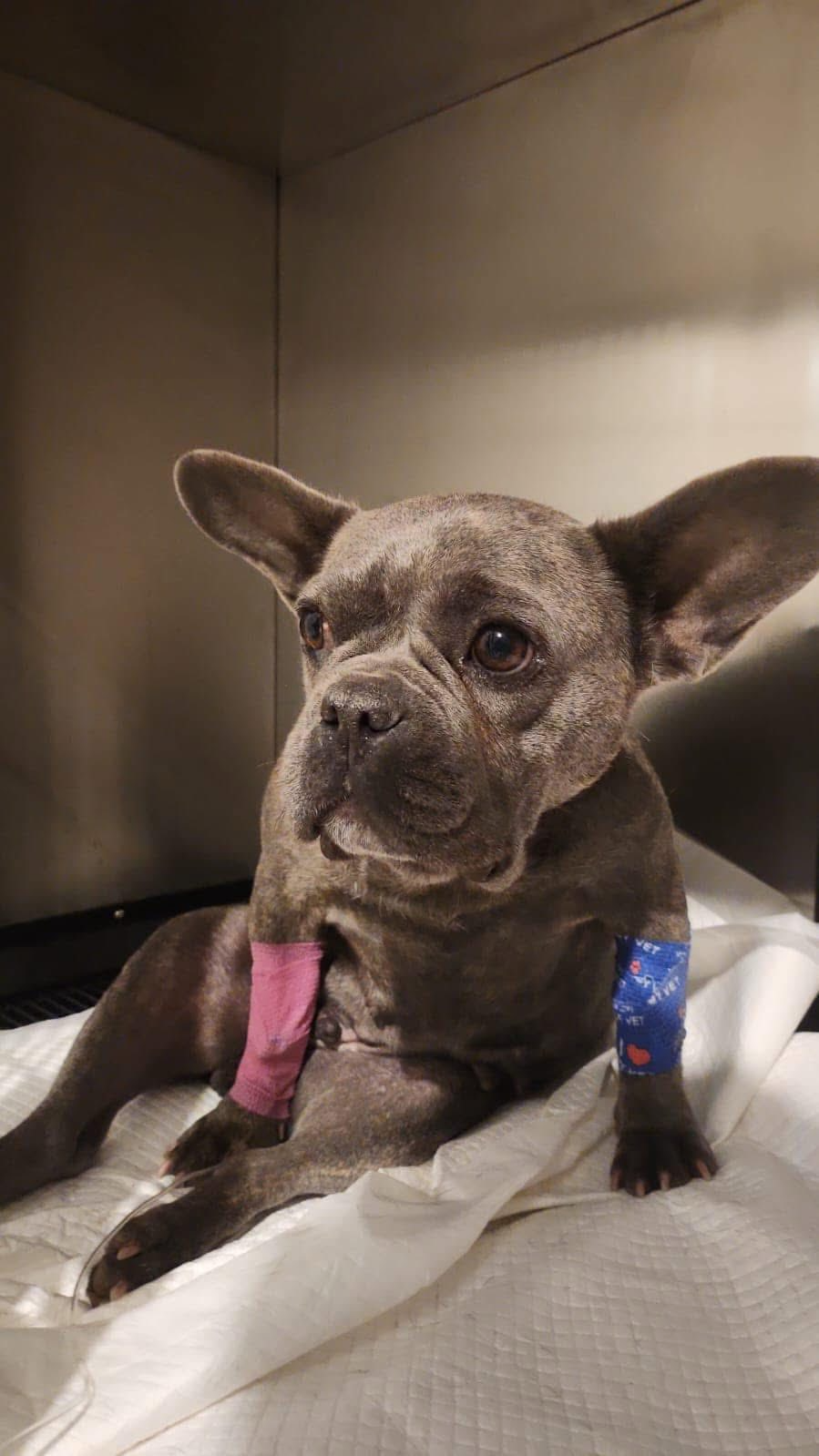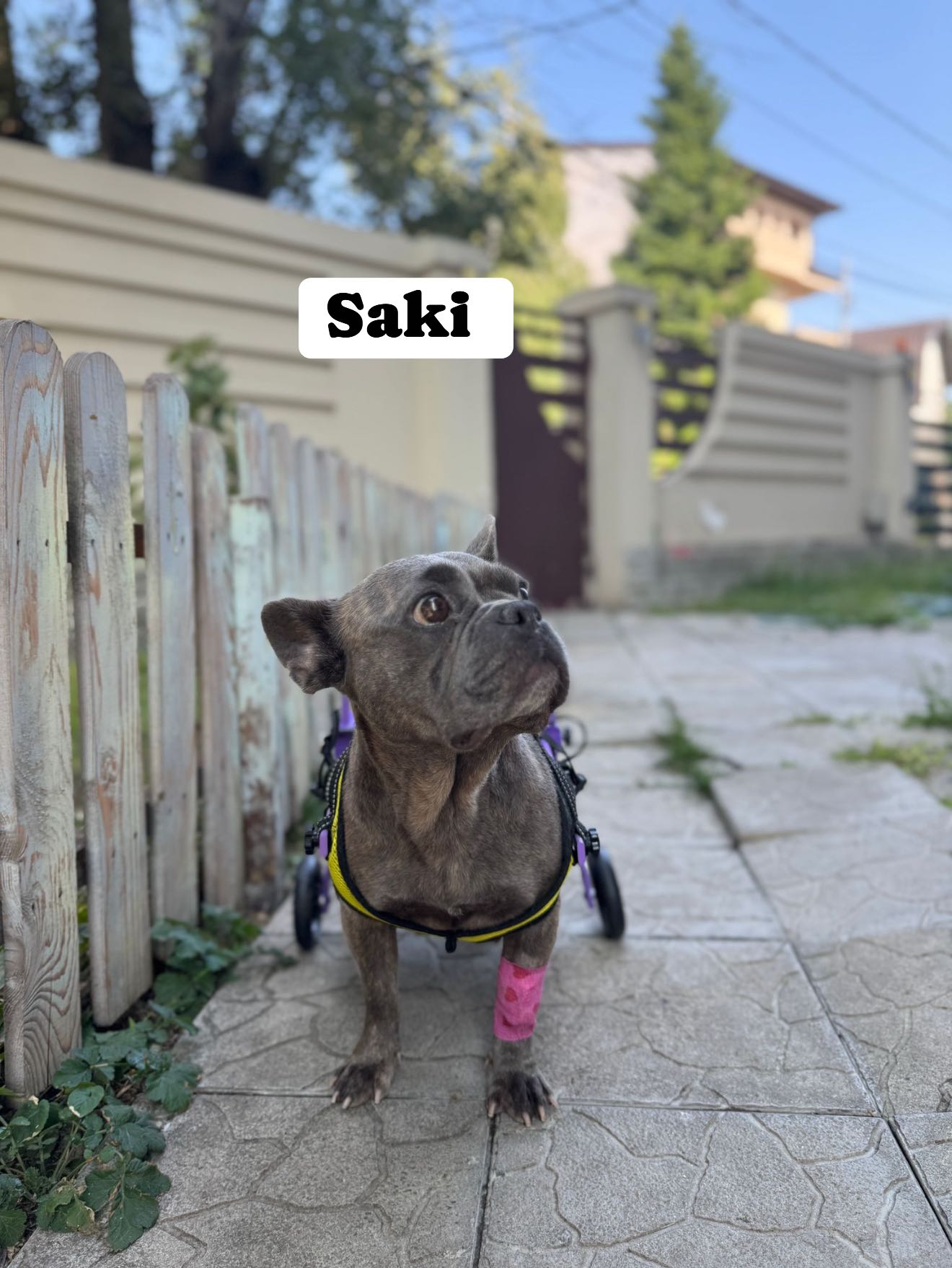 Saki, o bulldogea franceză operată în 2024 de hernie, rămăsese paralizată deoarece nu fusese îngrijită corespunzător după intervenție, așa cum recomandase medicul. Locuia afară, în frig, ploaie și căldură, plină de teamă.
